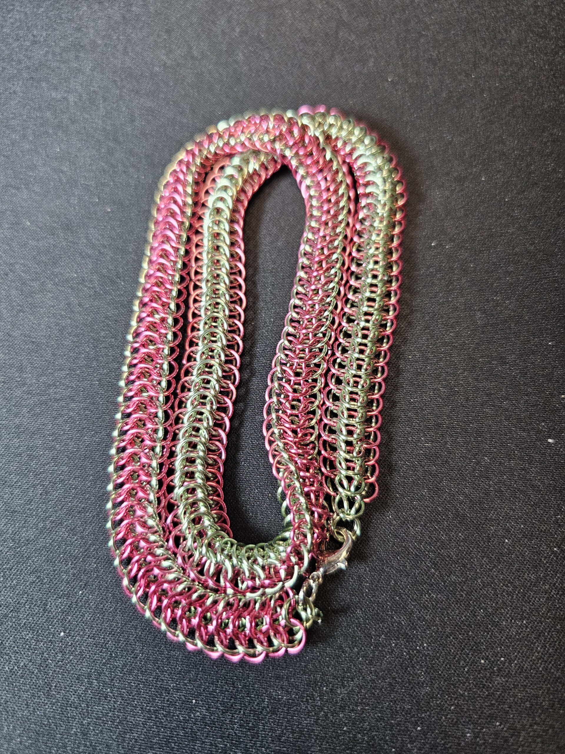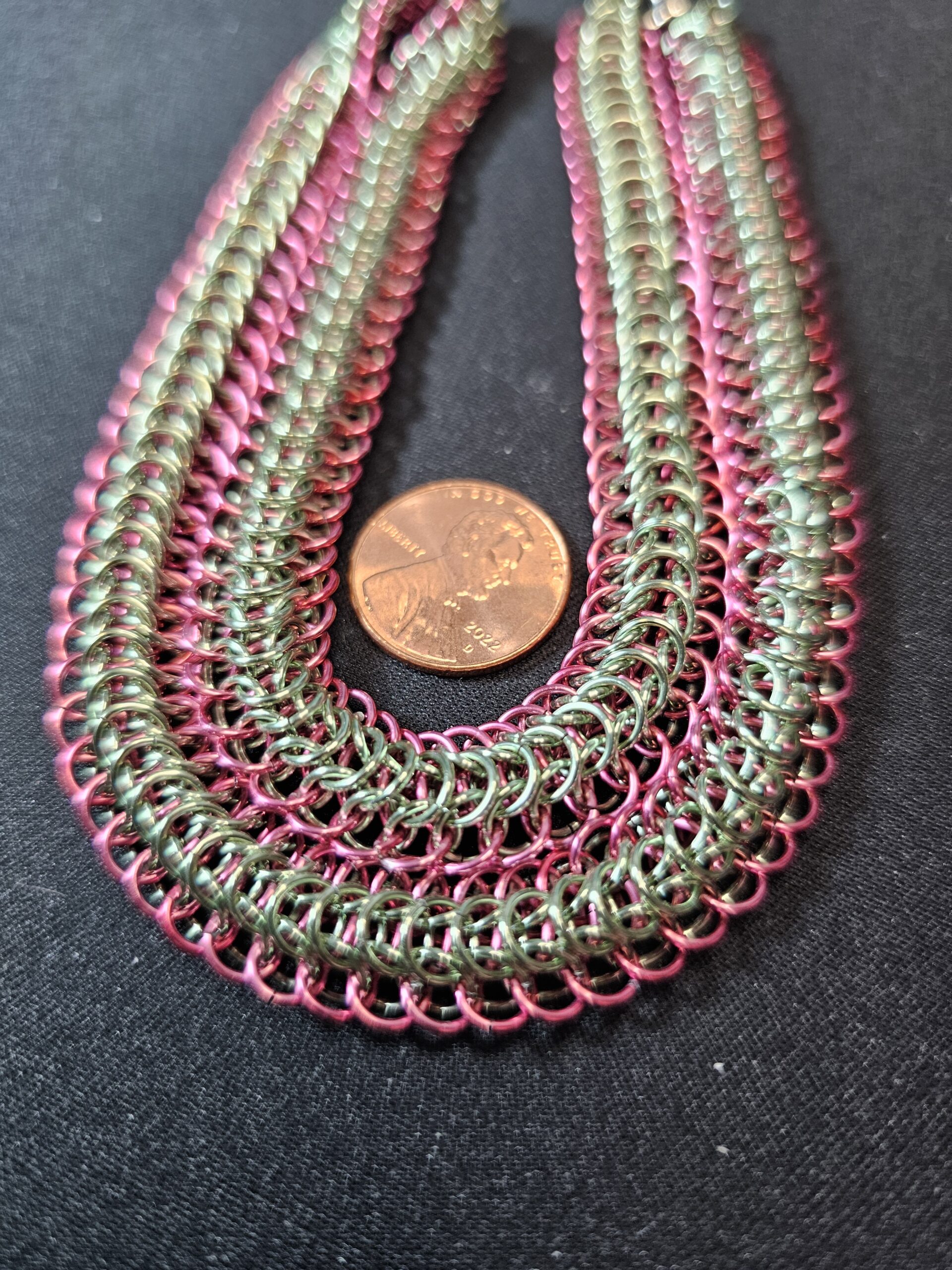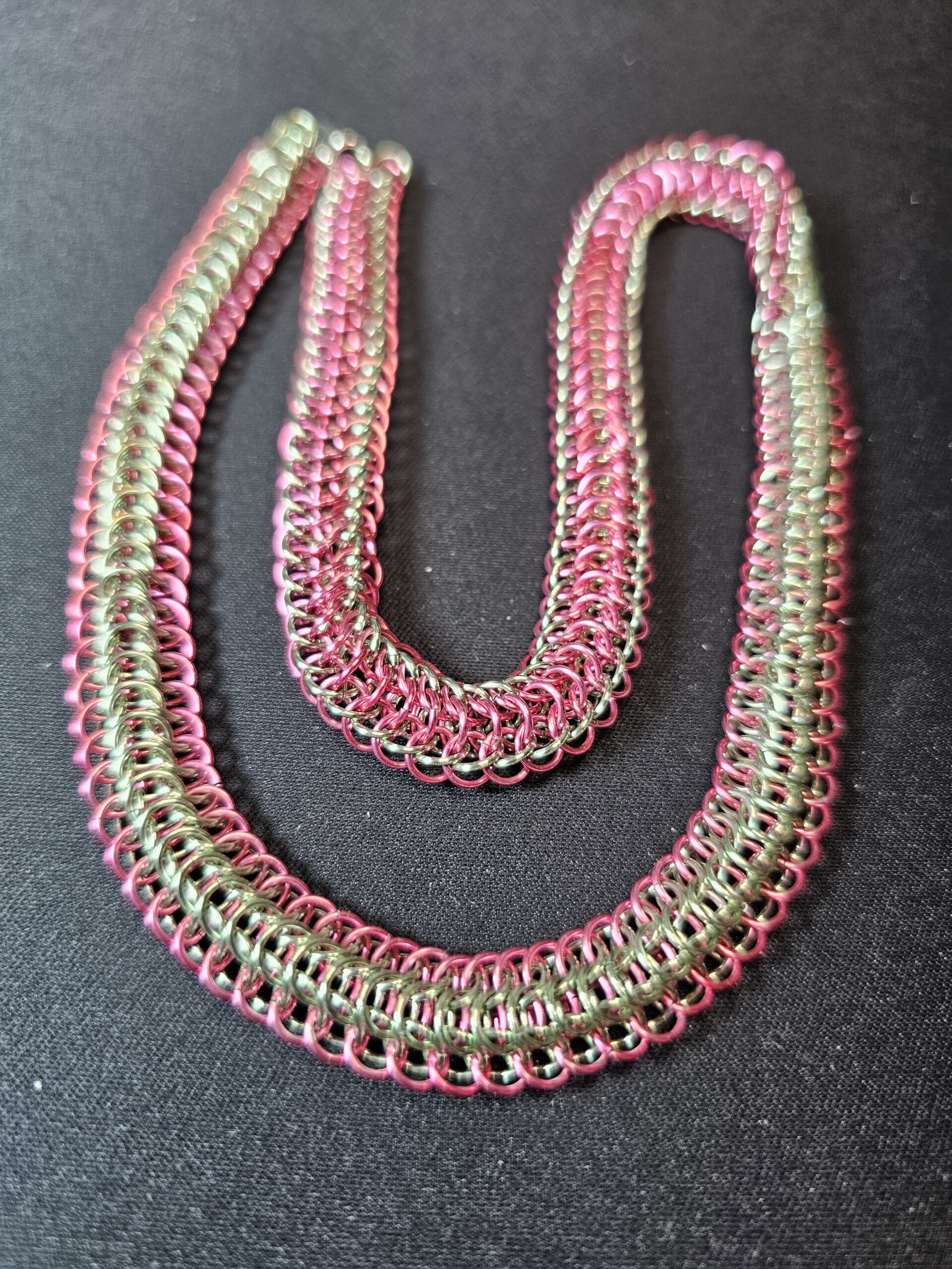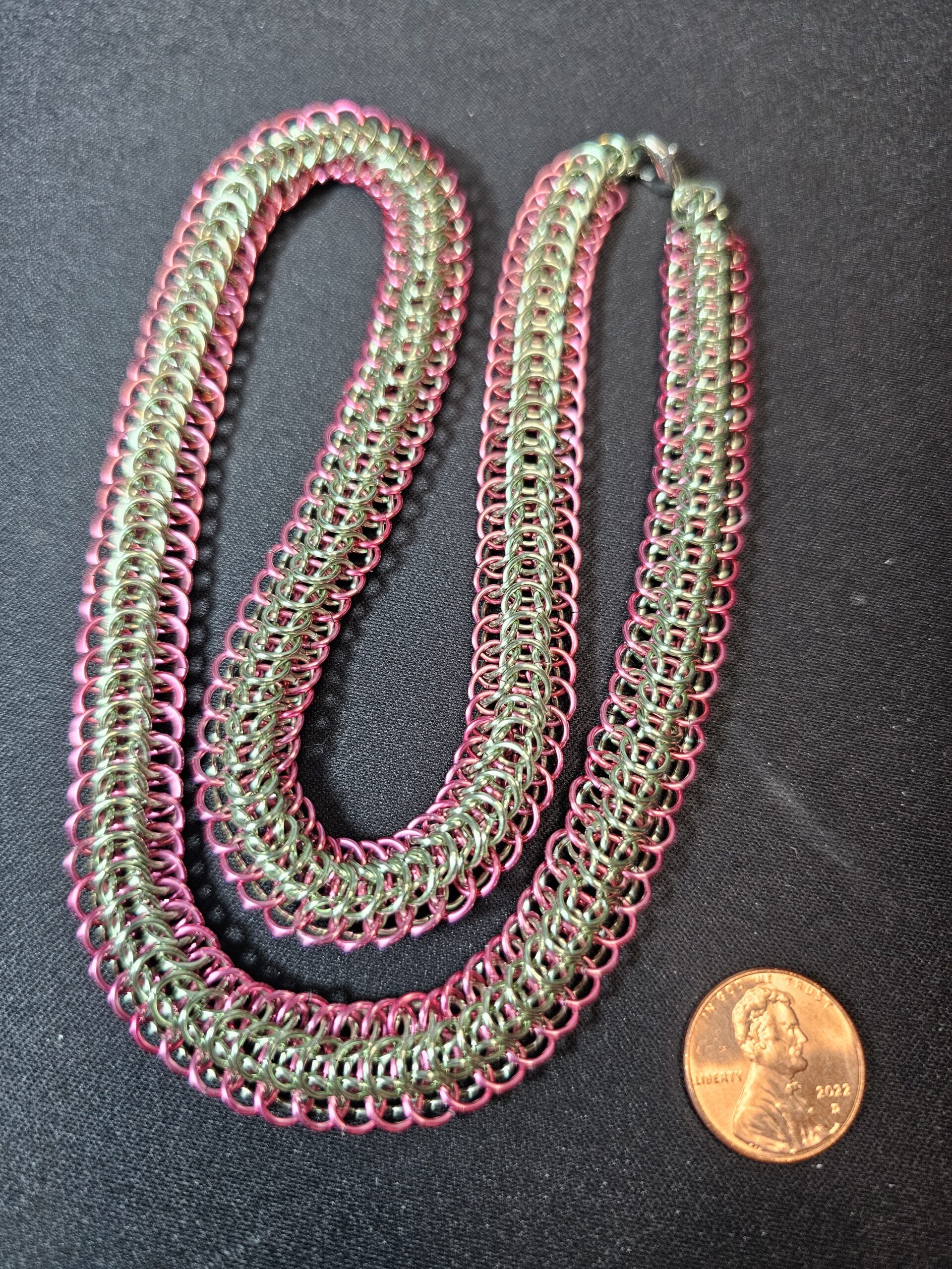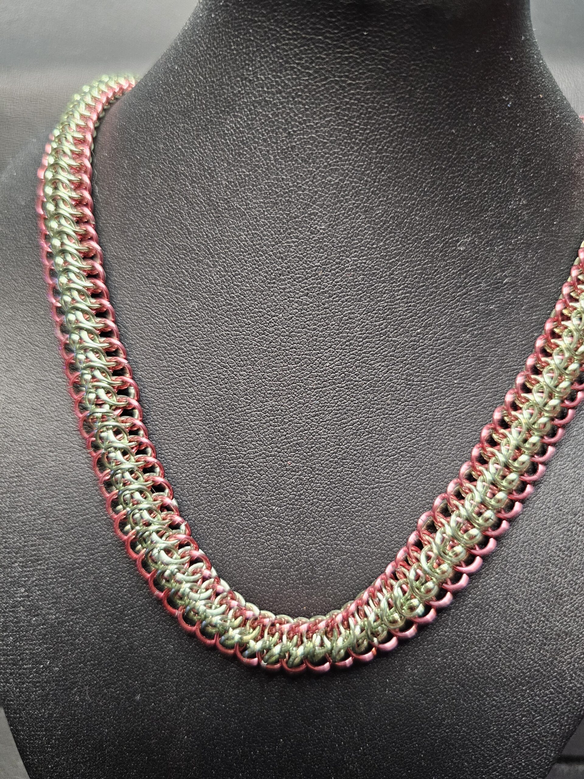 The Dragonsback Weave Chainmail Necklace is a captivating and intricately designed piece that showcases the bold and complex Dragonsback weave, making it a standout accessory for those who appreciate medieval-inspired craftsmanship. This necklace is meticulously handcrafted from interlocking metal rings arranged in the Dragonsback pattern, known for its robust, layered structure and striking visual appeal. The unique weave forms a textured, spine-like design, reminiscent of dragon scales, giving the necklace an aura of strength, elegance, and mystery.